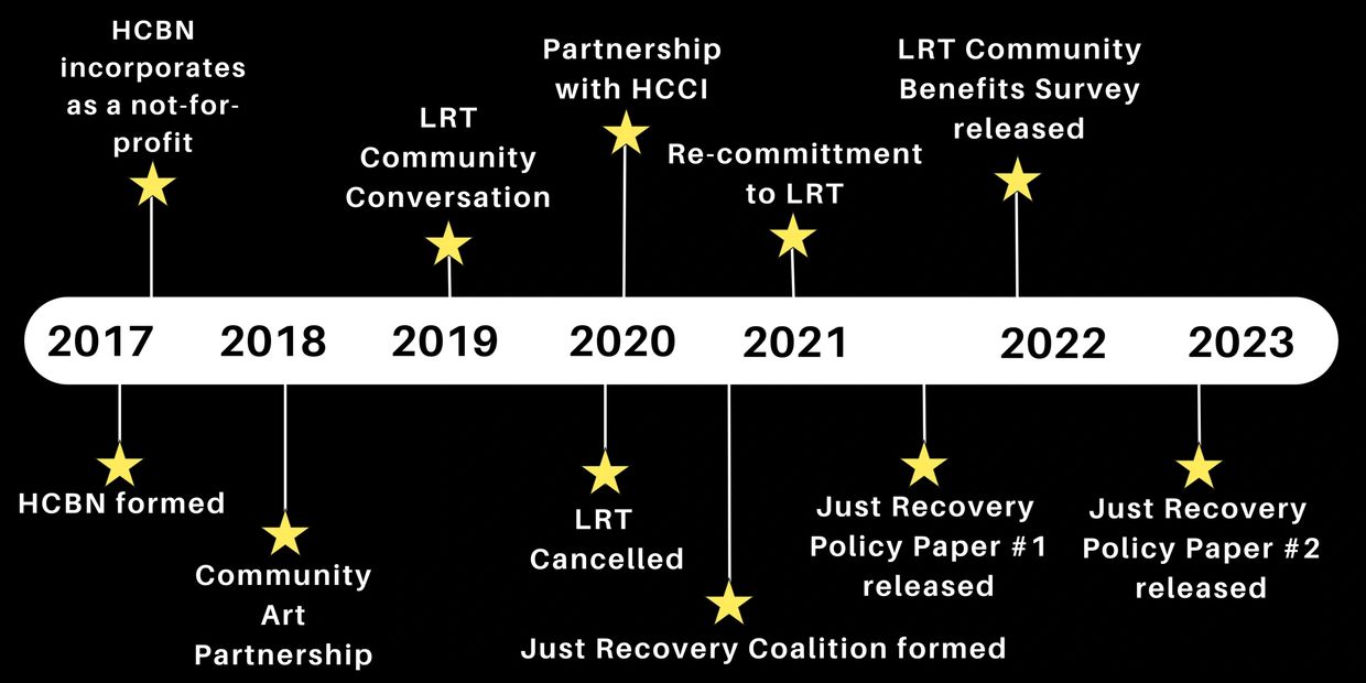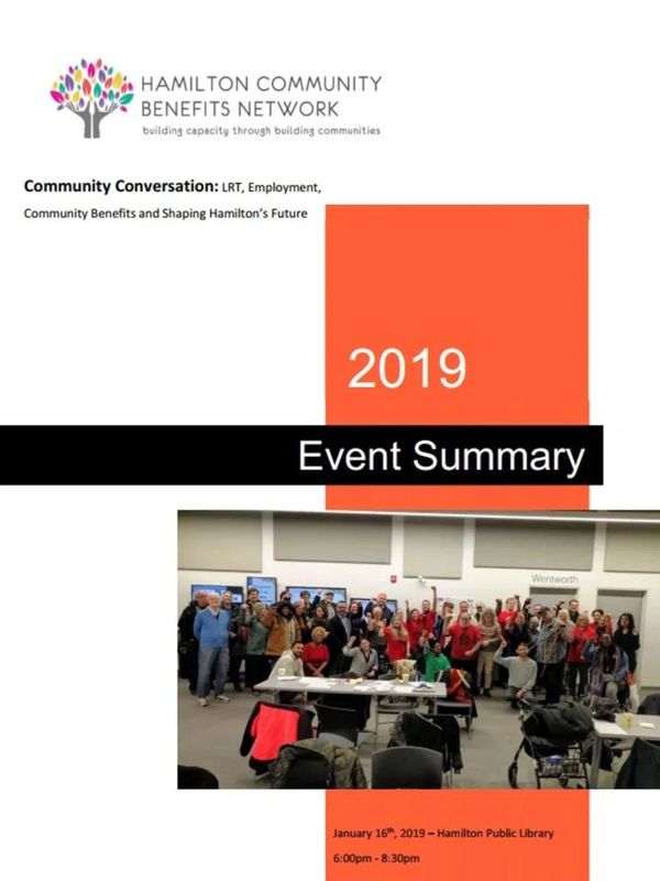 The HCBN began in response to the opportunities presented by the Hamilton Light Rail Project. With pressure and from the community, the previous Ontario government included in Bill 6: The Ontario Infrastructure for Jobs and Prosperity Act, a mandate for Community Benefit requirements for some infrastructure projects in Ontario. Inspired by the success of the Toronto Community Benefits Network (TCBN) and the opportunity afforded by the Hamilton Light Rail project, The Hamilton Community Benefits Network was formed. The original Foundation Document was produced by Karen Lior and Patrick Rettig of the Toronto Workforce Innovation Group (TWIG). The Toronto Foundation Document on approval from the TCBN was utilized and revised by the HCBN to formally become the HCBN Foundation Document.