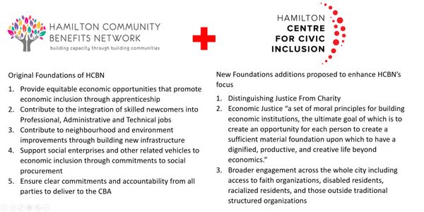 The Hamilton Centre for Civic Inclusion was chosen as our charitable partner to provide logistical support in rebuilding the network. Currently in partnership with HCCI, the HCBN seeks to rebuild the existing membership and reach out to the many voices that were not included in the original outreach. HCCI and HCBN want to move forward with a community-focused organization that is centered on economic justice, education, cross-city community engagement and empowerment.